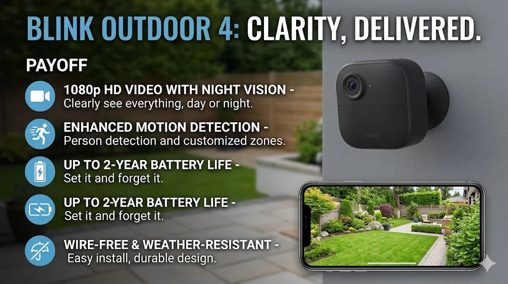 The Scalable Simplicity Pick: Blink Outdoor 4 If you need to secure a large perimeter without the hassle of wires or solar panels, choose Blink. Its legendary 2-year battery life and Sync Module 2 allow you to stick a camera anywhere and centralize all your footage onto a single USB drive. It’s the fastest, most reliable way to get full-perimeter coverage on a budget.