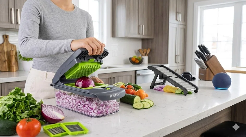 This professional mandoline slicer kit enables consistent, precise slicing of fruits and vegetables, transforming prep work with its interchangeable blade system. It includes essential safety accessories like cut-resistant gloves and a food guard, along with an integrated container to neatly collect slices.