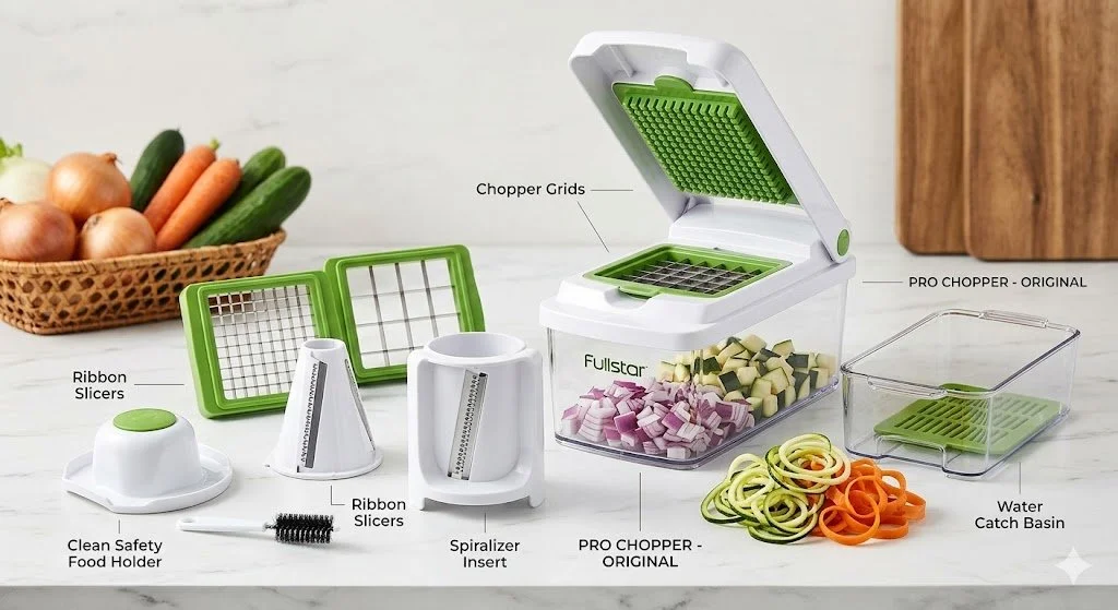 Effortlessly chop and spiralize your way to healthy, delicious meals with the Fullstar 4-in-1 Vegetable Chopper and Spiralizer. This versatile kitchen essential features four interchangeable stainless steel blades, a 5-cup container, and a compact design, making meal prep a breeze for busy home cooks.