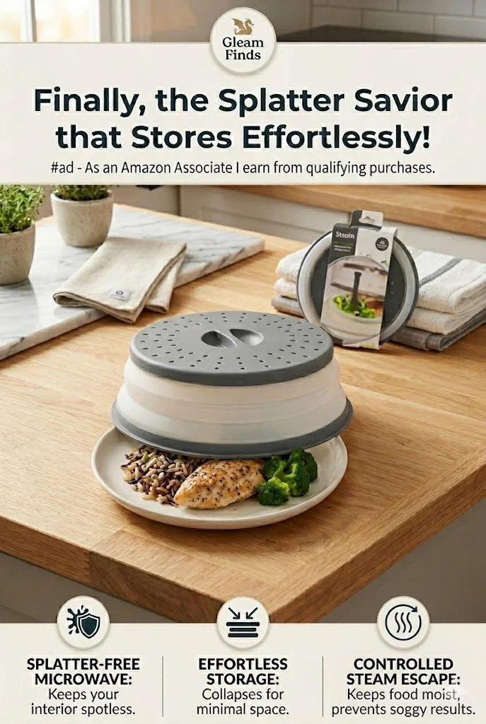Keep your microwave spotless and your food perfectly moist with this collapsible splatter shield that folds flat for effortless, space-saving storage. Experience the Gleam Finds difference with a vented design that prevents soggy meals, leaving you to wonder why you ever settled for messy paper towels.